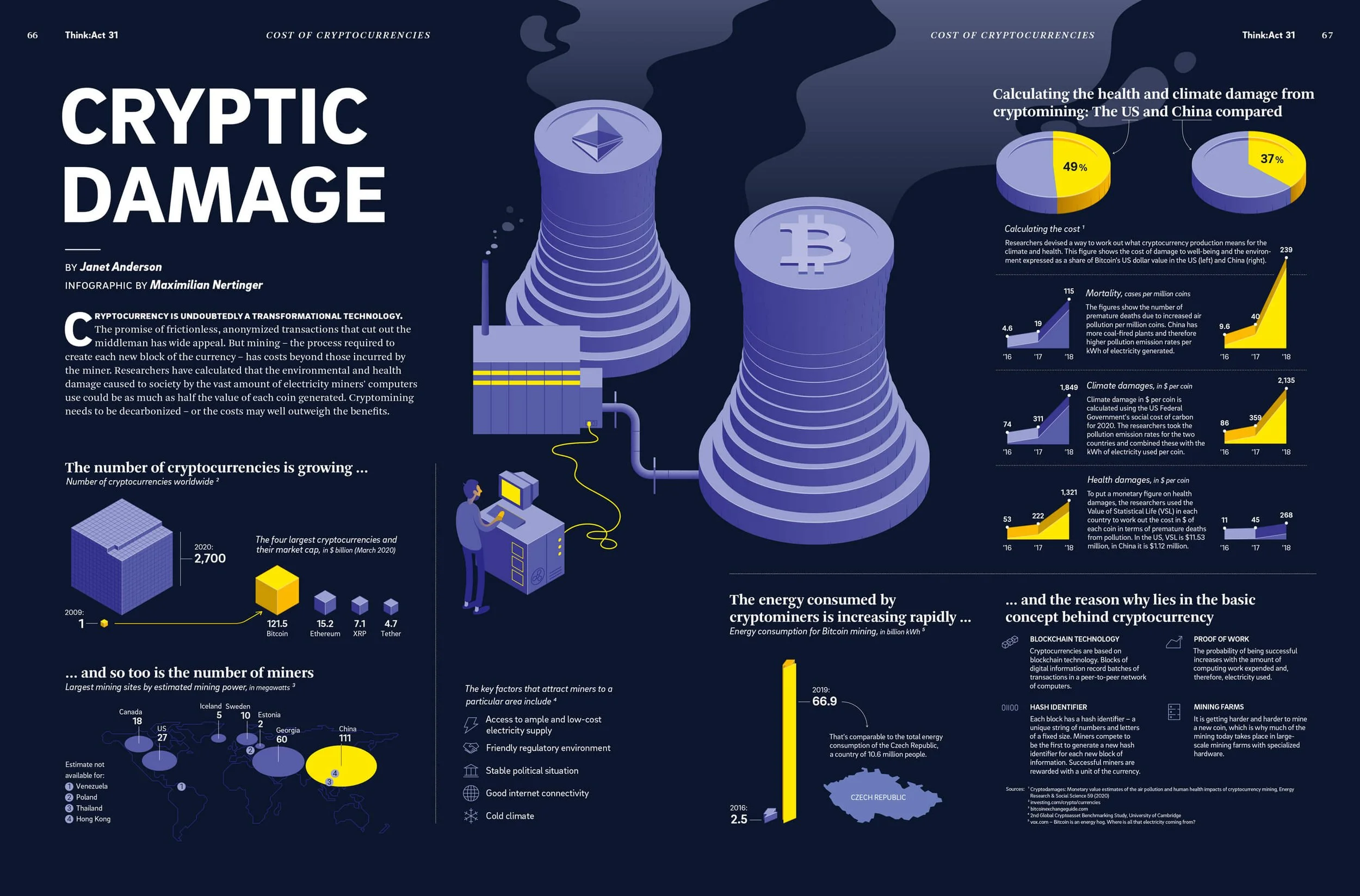 Infographic created for Roland Berger’s Think:Act magazine. It explores cryptocurrency's environmental toll, showing that mining's energy demands can offset up to half the value of each coin. Decarbonization is essential to balance crypto’s promise with its environmental impact.