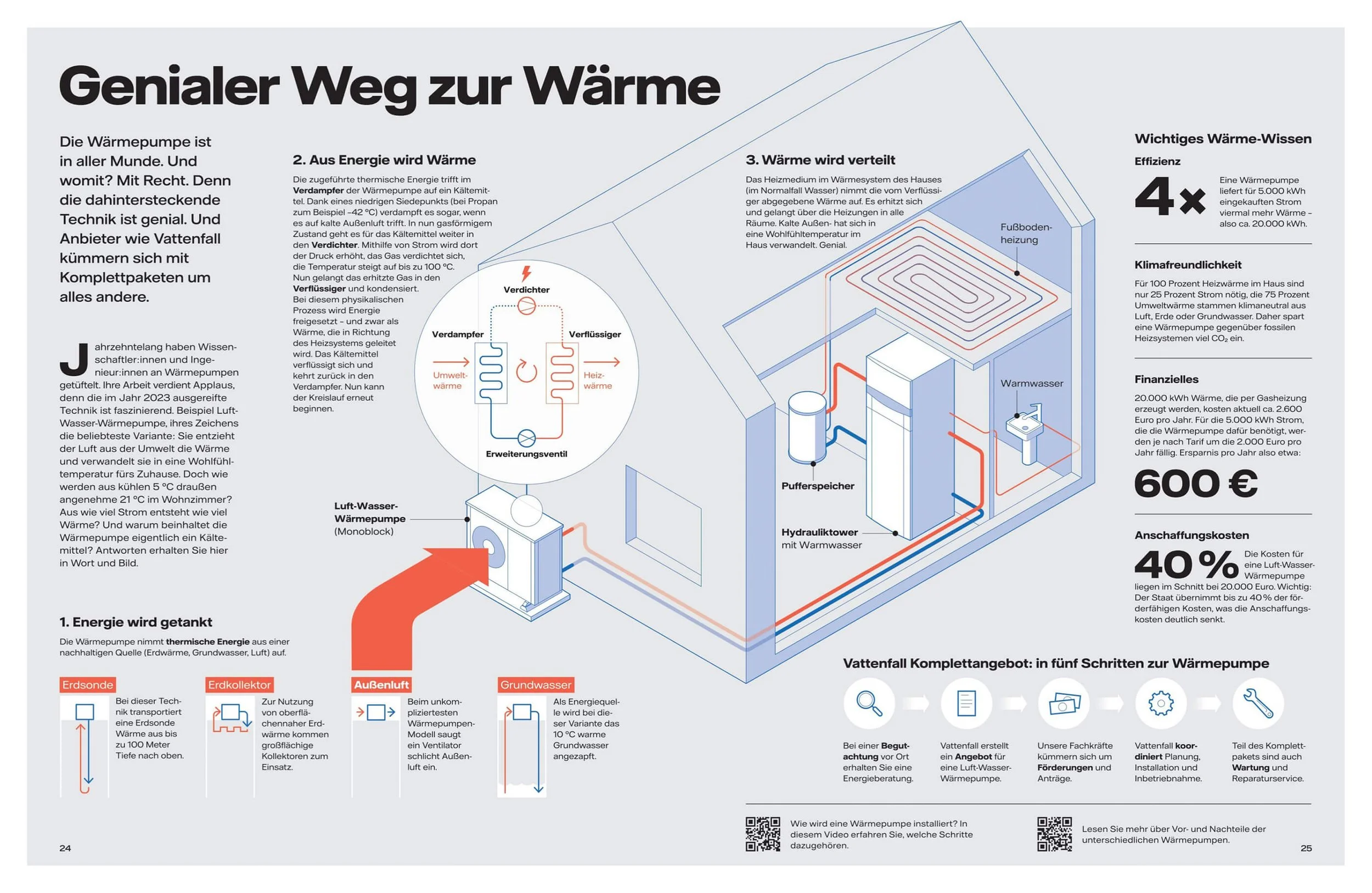 Illustrative infographic for myhighlights magazine on the innovative heat pump technology, highlighting Vattenfall’s complete solutions.