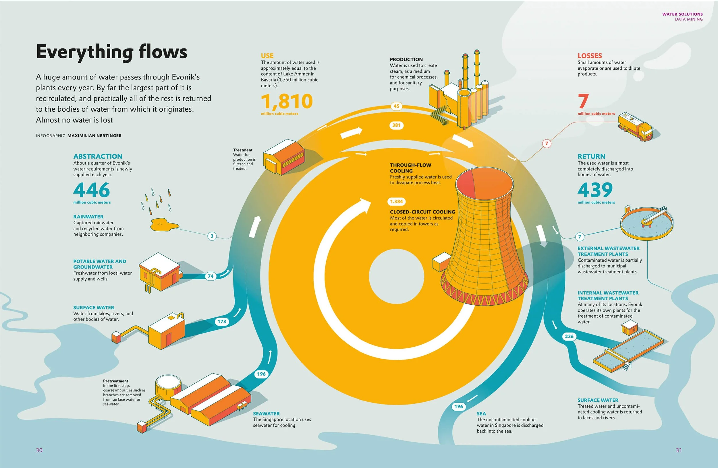 This graphic is based on the actual quantities of processed water and the various stations it runs through. The magazine features additional graphics on water processing.